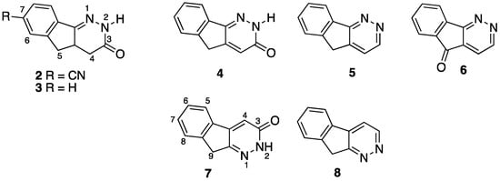 Structures of indeno-pyridazinones 4 and 7 and indeno-pyridazines 5, 6, and 8.