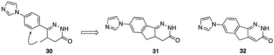 Taking into account the potent positive inotropic activity of a series of 4,5-dihydro-6-[4-(1H-imidazol-1-yl)phenyl]-3(2H)-pyridazinones, i.e., compound 30 (Figure 7), Sircal et al. synthesized and evaluated the positive inotropic activity of a series of 5H-indeno[1,2-c]-3(2H)-pyridazinones (including 9, 10, Figure 4) and the benzo[h]cinnolinone 22 (Figure 5) []. Most of these tricyclic pyridazinones (i.e., 31 and 32) demonstrated strong positive inotropic activity in the same range as that of their freely rotating acyclic analogs. Interestingly, in their screening, compound 10 retained an inotropic activity comparable to or slightly higher than that of the imidazole 31. By SAR studies, the authors concluded that a generally planar ring structure is desirable for maximum positive inotropic effects. Several of these tricyclic pyridazinones were evaluated for PDEIII-inhibitory activity. Compounds 31 and 32 possessed similar potency (31: IC50 1.8 μM, 32: IC50 1.6 μM) to 30 (IC50 1 μM), which also explained the similar inotropic activity of these compounds.