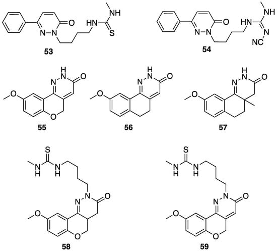 Structure of thiourea or 2-cyanoguanidine-based 3(2H)-pyridazinone derivatives 53 and 54, 5H-[1]benzopyrano[4,3-c]pyridazin-3(2H)ones 55, 58, and 59, and benzo[h]cinnolinones 56 and 57.