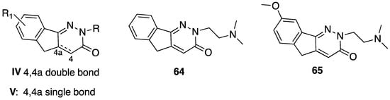 DNA intercalators are a class of drugs featuring a planar poly-aromatic system that can be inserted between the base pairs of DNA through hydrophobic interactions, van der Waals attractions, hydrogen bonding, and/or charge transfer processes. Such interactions hamper DNA replication. A further structural feature of DNA intercalators is the presence of at least one flexible cationic side chain linked to the heteroaromatic ring, which interacts with the negatively charged phosphate DNA backbone, playing a critical role in the affinity and selectivity of such compounds. On this basis, Cignarella et al. undertook a research program designed to verify whether the tricyclic indenopyridazinone of general formula IV and its dihydro analog V (Figure 14) could be appropriate scaffolds for the development of DNA-interacting anticancer agents. SAR studies were carried out on 14 compounds by testing their cytotoxic activity on LoVo and LoVo/DX human colon carcinoma cell lines and on L1210 and L1210/CDDP murine leukemia cell lines, and indicated that the double bond in position 4,4a is essential for activity. Compounds 64 and 65 exhibited comparable activity to cisplatin and melphalan against resistant cell lines and against both sensitive and resistant cell lines, respectively. DNA-binding studies on most of the active compounds have suggested that DNA is an important biological target for the cytotoxic activity of the reported indenopyridazinones. The authors concluded that further investigation is needed to understand the mechanisms (i.e., topoisomerase poisoning and free radical formation) through which 64 and 65 exert their cytotoxic effects [].