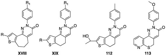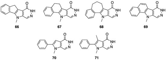 Our interest in the chemistry and pharmacology of polycyclic pyridazinones continued with the design and synthesis of a series of tetracyclic pyrrole[2,3-d]pyridazine-4-one derivatives (66–69, Figure 15) with an almost planar structure, potentially intercalating with DNA. These were evaluated in vitro by the National Cancer Institute against 60 human tumor cell lines derived from nine cancer cell types []. Moreover, to compare the variation in biological effects due to the loss of planarity of the ring system, 1-methyl-2-phenylpyrrole[2,3-d]pyridazine-4-one 70 and 1,3-dimethyl-2-phenylpyrrole[2,3-d]pyridazine-4-one 71, derived from 66 by the removal or cleavage of the carbon bridge between the phenyl and pyrrole moieties, were synthesized and included in the screening. The biological results showed that, with potency increasing in the order of 71 < 67 ≤ 68 < 69 < 66, the antitumor activities of these compounds were related to the planarity of their ring systems. Among these, the most potent compound 66 showed significant cell line cytotoxicity, particularly against the renal cancer subpanel (growth inhibition: GI50 5.07 μM) and significant potency against leukemia (MOLT-4, SR), non-small-cell lung (NCI-H460), colon (HCT-116), and CNS (SF-295) cancer cells (GI50 3.04–4.32 μM).