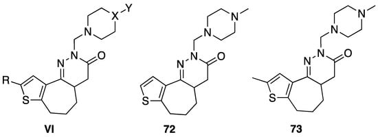 In a mini-review, Roman encompasses the biological activity of Mannich bases generated from various substrates through the introduction of an aminomethyl function by means of the Mannich reaction. Among various biological properties, Roman extensively reviewed the anticancer and cytotoxic properties of Mannich bases belonging to different chemotypes []. A few years earlier, our research group reported a series of twelve tricyclic hexahydrothienocycloheptapyridazinone Mannich bases of general formula VI (Figure 16) endowed with anticancer activity. A sulforhodamine B assay (SRB assay) was used for in vitro screening to evaluate growth inhibition properties, at a single 10 μM dose, against sixty different human tumor cell lines. Most of the compounds exhibited no activity on the cell lines tested, but two derivatives, namely 72 and 73, mildly inhibited the growth of non-small-cell lung cancer (EKVX and HOP-92) and glioblastoma (SNB-75) cell lines, respectively [].