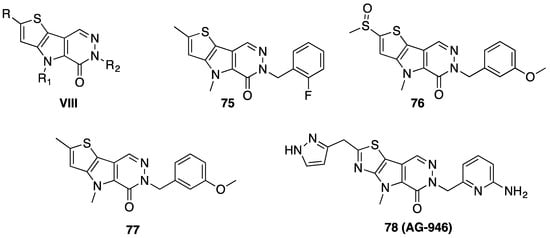 Structure of thieno[3,2-b]pyrrole[3,2-d]pyridazinones 75–77 and thiazolo[5′,4′:4,5]pyrrolo[2,3-d]pyridazin-5-one 78 (AG-946).