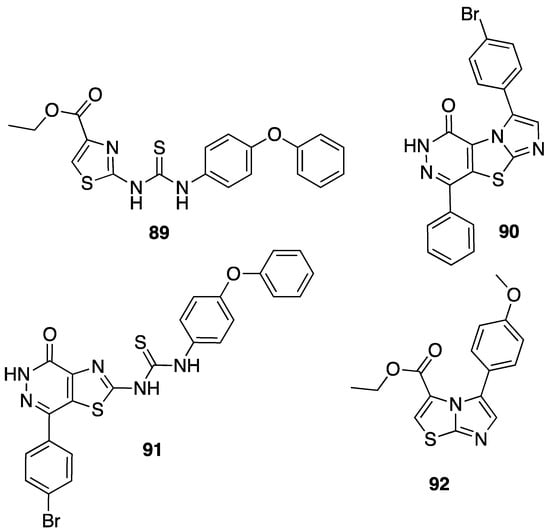 Using lead compound 89 (Figure 24), which carries carboxyl ester function along with a thioureido function and has an IC50 inhibition affinity of 0.05 μM, as a reference, Ewida et al. designed and synthesized a series of 1,3-thiazole-containing heterocycles acting at the DHFR enzyme active site. Modification carried out on compound 89, notably the replacement of the thiazole scaffold with imidazo[2,1-b]thiazole and the annexation of carboxyl ester function into a pyridazinone unit, provided the tricyclic imidazo[2′,1′:2,3]thiazolo[4,5-d]pyridazinone 90 with an IC50 value of 0.06 μM []. Interestingly, SAR studies have shown that ring annexation of the active 1,3-thiazole ring of 89 in the bicyclic thiazolo[4,5-d]pyridazinone (i.e., 91, IC50 = 0.35 μM) or imidazo[2,1-b]thiazoles (i.e., 92, IC50 = 49.67 μM) reduced DHFR inhibition activity, whereas the formation of the tricyclic imidazo[2′,1′:2,3]thiazolo[4,5-d]pyridazinone increased the potency, with 90 being the most representative of these novel DHFR inhibitors. Compound 90 proved to be lethal for OVCAR-3 ovarian cancer and MDA-MB-435 melanoma cells at IC50 = 0.32 and 0.46 μM, respectively.