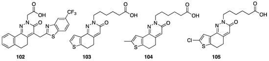 Pyruvate kinase muscle 2 (PKM2), a subtype of pyruvate kinase (PK), regulates the final step of the glycolytic pathway: the transformation of phosphoenolpyruvate and ADP to pyruvate and ATP. It plays a key role in regulating cell metabolism. Many reports highlight the importance of this kinase in cancer progression and different inhibitors, and agonists of PKM2 have been described for future cancer treatment []. Activators of PKM2 based on a substituted thieno[3,2-b]pyrrole[3,2-d]pyridazinone scaffold were described by Thomas et al., from the National Institutes of Health Chemical Genomics Center (general formula VIII, Figure 18). These compounds were discovered through a high-throughput quantitative screen of nearly 300.000 small molecules using the firefly luciferase assay system []. Compound 75, with a maximum response at 57 μM of 122% relative to FBP (fructose-1,6-bis-phosphate), showed good and selective potency to activate PKM2 (AC50 = 63 nM). Its optimization led to improved compounds in terms of activity and solubility, such as the methylsulfoxide-substituted derivative 76, which shows activation properties (AC50 = 73 nM, 99% maximal response) similar to those of the parent pyridazinone 75 but with improved aqueous solubility (37.4 μg mL−1).
