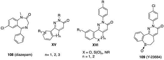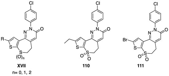 - Tanaka, H.; Kirihara, S.; Yasumatsu, H.; Yakushiji, T.; Nakao, T. Synthesis and structure-activity analysis of 2-(4-chlorophenyl)-5,6-dihydrothieno[2’,3’:2,3]thiepino[4,5-c]pyridazin-3(2H)-ones as ligands for benzodiazepine receptors. Eur. J. Med. Chem. 1995, 30, 859–868. [Google Scholar] [CrossRef]