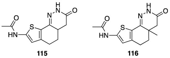 Following the above-mentioned bioisosteric approach, and taking the significant antihypertensive and antithrombotic properties of 4,4a,5,6-tetrahydrobenzo[h]cinnolinone derivative 22 (Figure 5) as a reference, the thieno[2,3-h]cinnolin-3(2H)-ones, 40 and 41 (Figure 10), were designed, synthesized, and pharmacologically evaluated. Compound 41 and the unsubstituted term 40, with respect to the bioisoster 22, retained antithrombotic properties which were higher than (41) or comparable to those of ASA but without significant antihypertensive activity. Conformational analysis suggested that the absence of activity may result from a different orientation of the acetylamino group in compounds 22 and 41. Further, thieno[2,3-h]- and thieno[3,2-h]cinnolin-3(2H)-ones, 42, 43 and 44, 45, respectively (Figure 10), were designed, synthesized, and evaluated for their pharmacological profile. In vivo tests revealed that only 45 exhibited antihypertensive properties comparable to compound 22, while all derivatives had a lower hypotensive activity. All compounds, except 42, were more potent than 22 in the inhibition of collagen-induced platelet aggregation []. The 4a-methyl-substituted-thieno[2,3-h]cinnolin-3(2H)-ones 46–48 were also synthesized. Their pharmacological profile was evaluated in comparison to 22. In vivo tests showed that 46 displayed lower levels of antihypertensive activity with respect to 22. Tricyclic thienocinnolinones 46–48 demonstrated potent platelet-antiaggregating activity [].