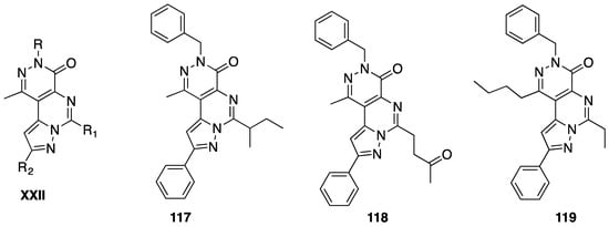 - Giovannoni, M.P.; Claudia Vergelli, V.; Cilibrizzi, A.; Crocetti, L.; Biancalani, C.; Graziano, A.; Dal Piaz, V.; Loza, M.I.; Cadavid, M.I.; Díaz, J.L.; et al. Pyrazolo[1’,5’:1,6]pyrimido[4,5-d]pyridazin-4(3H)-ones as selective human A1 adenosine receptor ligands. Bioorg. Med. Chem. 2010, 18, 7890–7899. [Google Scholar] [CrossRef]