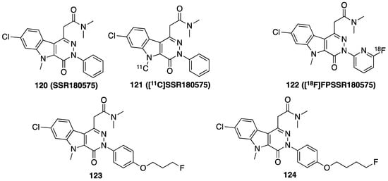 - Salerno, S.; Viviano, M.; Baglini, E.; Poggetti, V.; Giorgini, D.; Castagnoli, J.; Barresi, E.; Castellano, S.; Da Settimo, F.; Taliani, S. TSPO radioligands for neuroinflammation: An overview. Molecules 2024, 29, 4212. [Google Scholar] [CrossRef]