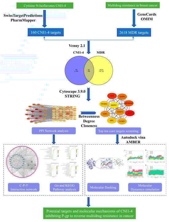 To bridge this knowledge gap, we established a comprehensive computational framework (Figure 1) consisting of three key components: (1) target prediction using SwissTargetPrediction (version 2019) and PharmMapper (version 2017), followed by intersection analysis with established breast cancer MDR targets from the OMIM and GeneCards databases; (2) the identification of core targets through protein–protein interaction network analysis coupled with functional enrichment (GO/KEGG) using DAVID (version 6.8) (3) the evaluation of binding modes via molecular docking, with subsequent molecular dynamics simulations to validate the stability of high-affinity complexes. This multi-dimensional strategy not only provides systematic insights into CNI1-4’s MDR reversal mechanisms but also establishes a crucial theoretical foundation for developing next-generation P-gp inhibitors with improved efficacy and safety profiles.