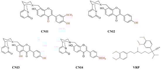 Our team initially isolated a novel natural compound, chrysoerioline N-methylene-(4’,7-dihydroxy-3’-methoxy)-isoflavone, from the Chinese herb bitter pea. Based on this, a series of chrysoerioline–isoflavone derivatives were synthesized, leading to the identification of four optimal compounds (CNI1-4) for reversing drug resistance through structural optimization []. The molecular structures of CNI1-4, along with the structural formula of the positive control VRP, are displayed in Figure 2.