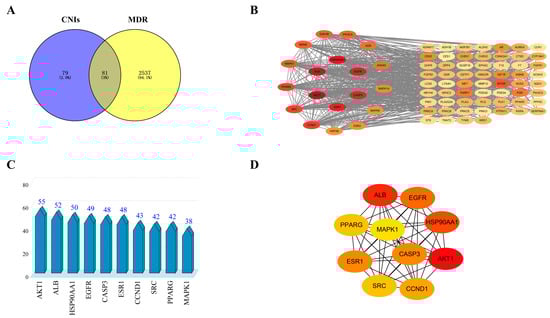 CNI1-4 reversal of MDR potential targets and protein–protein interaction (PPI) networks in breast cancer. (A) Venn diagram showing potential targets. (B) PPI network of 81 potential targets. (C) Top 10 potential targets sorted by degree value. (D) PPI network of core targets in the top 10 of the ranking.