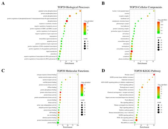 Functional annotation and KEGG pathway enrichment analysis of 81 potential breast cancer MDR targets. (A) Bubble plot showing the top 20 BPs. (B) Bubble plot showing the top 20 CCs. (C) Bubble plot showing the top 20 MFs. (D) Bubble plot showing the top 20 KEGG pathways.