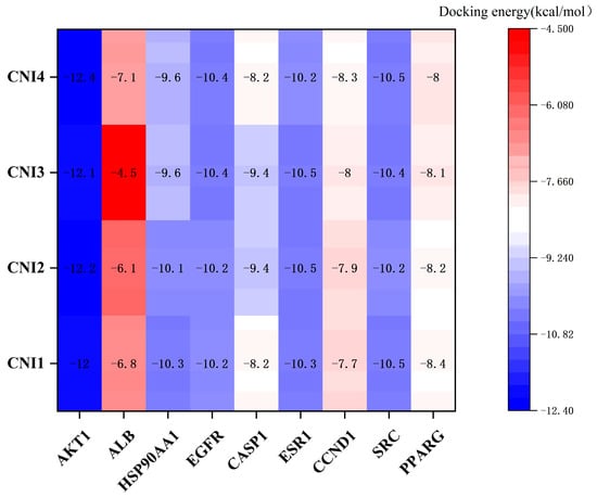 Docking scores of CNI1-4 against targets with degree values > 40. A lower score indicates a stronger binding ability.