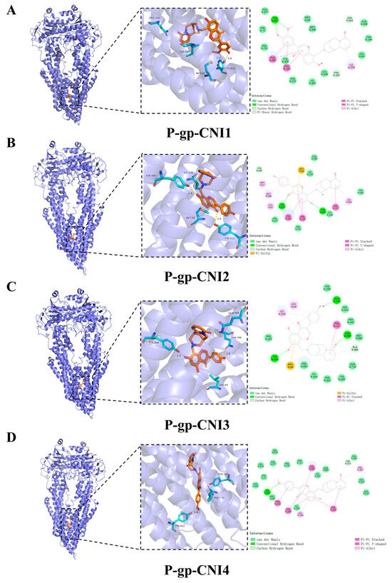 In MM-PBSA calculations, the total binding free energies of P-gp-CNI1, P-gp-CNI2, P-gp-CNI3, P-gp-CNI4, and P-gp-VRP were −38.5902, −39.0606, −35.9709, −45.4900, and −41.7985 kcal/mol, respectively (Table 3). All complexes exhibited strong interactions, with P-gp-CNI4 displaying the lowest binding free energy, stronger than that of P-gp-VRP. However, cellular experiments revealed that CNI3 had the most effective reversal of MDR in MCF-7/DOX-resistant cells when combined with DOX, while CNI4 alone demonstrated the greatest cytotoxicity against these cells. The discrepancy between the computational and experimental results can be attributed to the fact that the cellular experiments involved the co-administration of CNI1-4 with DOX, whereas molecular dynamics simulations only examined the interaction of CNI1-4 with P-gp. This difference arises from the divergence between the simulated and experimental environments. Future simulations involving both CNI1-4 and DOX in conjunction with P-gp will be conducted to further validate these findings.