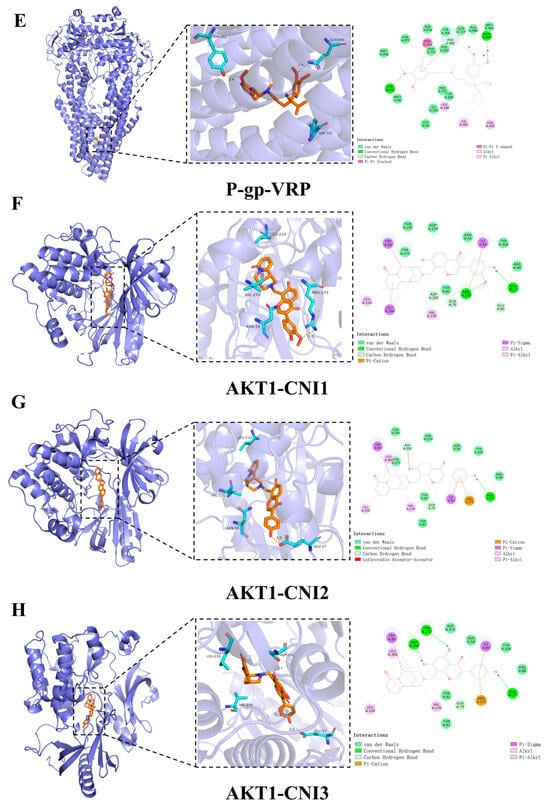 Preliminary virtual screening revealed that CNI1-4 exhibited strong binding affinity with P-gp, with substrate competition at the P-gp binding site identified as a key mechanism for overcoming MDR in breast cancer. Molecular docking analysis was conducted to assess the binding modes and potential interactions of CNI1-4 with the positive control drug VRP at the P-gp binding site (6FN1). The results, including interactions with specific amino acid residues, are presented in Table 1. The binding affinities of CNI1-4 with P-gp ranged from −9.6 to −10.2 kcal/mol, which were lower than the binding energy of CNI1-4 with VRP, indicating that CNI1-4 possesses potent anti-breast cancer MDR activity, with a binding strength surpassing that of the positive control. Additionally, molecular docking of CNI1-4 was performed against targets in the PPI network with degree values exceeding 40, including AKT1 (6S9W), ALB (8RGL), HSP90AA1 (2BZ5), EGFR (3POZ), CASP1 (6CKZ), ESR1 (3CBP), CCND1 (6P8E), SRC (2H8H), and PPARG (5Z6S). The docking results, shown in Figure 6, revealed binding energies for AKT1-CNI1-4, EGFR-CNI1-4, ESR1-CNI1-4, and SRC-CNI1-4 below −10 kcal/mol, indicating strong interactions. Notably, CNI1-4 exhibited the strongest binding with AKT1, consistent with network pharmacology findings.