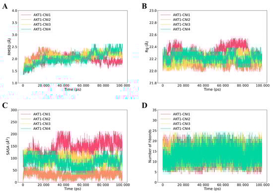 Molecular dynamics (MD) simulations of the AKT1-CNI1-4 complex. (A) Root mean square fluctuation (RMSD) values extracted from the protein fit ligand of the protein–ligand docked complexes. (B) The compactness of the protein structure in terms of the radius of gyration (Rg). (C) Solvent-accessible surface area (SASA) analysis. (D) H bond formation between AKT1 and CNI1-4.