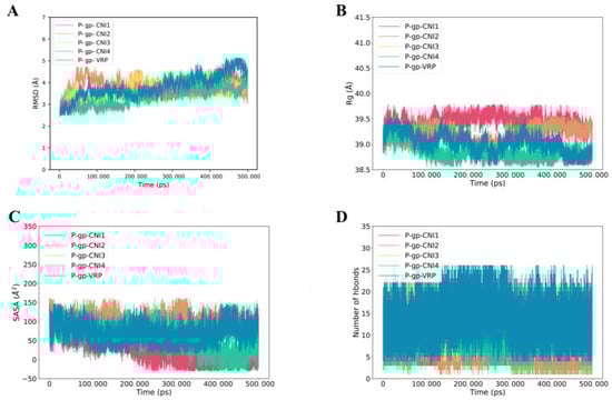Molecular dynamics (MD) simulations of P-gp-CNI1-4 and P-gp-VRP complexes. (A) Root mean square fluctuation (RMSD) values extracted from the protein fit ligand of the protein–ligand docked complexes. (B) The compactness of the protein structure in terms of the radius of gyration (Rg). (C) Solvent-accessible surface area (SASA) analysis. (D) H bond formation between P-gp and CNI1-4, VRP.