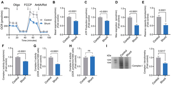 Confirming prior work [39,40,41,42], an OCR analysis using the Seahorse XFe24 extracellular flux analyzer in conjunction with the Mitostress test kit, Shunt PAECs have decreased bioenergetics (Figure 1A) with basal respiration (Figure 1B), the O2 consumed for ATP production (Figure 1C), and maximal (Figure 1D) and reserve (Figure 1E) respiratory capacities all being suppressed. Further, the decrease in bioenergetics correlated with attenuated ETC Complex I (Figure 1F) and II (Figure 1G) activities. However, Complex III activity remained unchanged (Figure 1H). Mitochondrial extracts (10 µg) from Control and Shunt PAECs were subjected to blue native polyacrylamide gel electrophoresis (BN-PAGE) to analyze the mitochondrial respiratory Complex I abundance, and reduced Complex I assembly was observed in Shunt PAECs (Figure 1I).