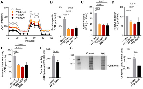 We next determined if inhibiting pp60Src activity could mimic the effects on Complex I activity we observed in PH-PAECs. To accomplish this, Control PAECs were exposed to increasing concentrations of the pyrazolopyrimidine compound PP2 (0, 2.5-, 5-, and 10-µM), a potent and selective inhibitor of the Src family protein tyrosine kinases [45]. Our data show that the inhibition of pp60Src by PP2 (at various concentrations) disrupted mitochondrial bioenergetics (Figure 3A) such that the basal respiration (Figure 3B), the O2 consumed for ATP production (Figure 3C), and the maximal respiratory capacity (Figure 3E) were all decreased. The reserve respiratory capacity was unchanged (Figure 3D). The activity of Complex I was also reduced by PP2 (10 µM) (Figure 3F). Lastly, we investigated if pp60Src inhibition influenced Complex I assembly. PP2-treated PAECs showed decreased Complex I assembly (Figure 3G).