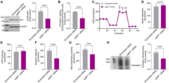 To confirm our pharmacological data, we investigated whether an siRNA-mediated knockdown of pp60Src would affect Complex I activity, Complex I assembly, and mitochondrial respiration. To accomplish this, HPAECs were transfected with a scrambled siRNA or siRNA specific to pp60Src (20nM) for 48 h. Results from the Western blot analysis confirmed a significant decrease in pp60Src protein levels in the pp60Src siRNA-transfected HPAECs (Figure 4A). Further, a significant reduction in ETC Complex I activity was also observed with the knockdown of pp60Src (Figure 4B). The knockdown of pp60Src also disrupted the bioenergetic profile (Figure 4C) such that reserve- (Figure 4F) and maximum (Figure 4G) respiratory capacities were decreased. Basal respiration (Figure 4D) and the OCR for ATP synthesis (Figure 4E) remained unchanged. The knockdown of pp60Src also decreased mitochondrial ETC Complex I assembly in HPAECs (Figure 4H). Together, these findings link reduced pp60Src mitochondrial localization to the disruption of ETC Complex I activity and attenuated mitochondrial bioenergetics.