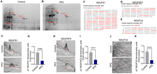 Inhibition of pp60Src modifies mitochondrial protein tyrosine phosphorylation. PAECs were treated with 10 µM PP2 for 24h. Affinity-captured phosphorylated mitochondrial proteins were separated by two-dimensional gel electrophoresis (2D-GE). The protein spots on the 2D gels were visualized using Coomassie staining. PP2 decreased mitochondrial protein tyrosine phosphorylation (B) compared to Control PAECs (A). MS/MS on the protein spots from the 2D gels identified NDUFS1 (C), NDUFAF5 (D), and NDUFV2 (E) with 45%, 24%, and 23% sequence coverage, respectively. Quantification of protein spots in the 2D gels reveals that PP2 treatment decreased phosphorylation levels in NDUFS1 (F,G), NDUFAF5 (H,I), and NDUFV2 (J,K) compared to the protein spots of respective Controls. Data are presented as means ± SEM. All experiments were performed with three biological replicates.