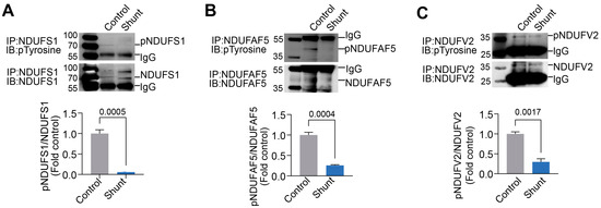 Using a phosphoprotein enrichment column, we captured mitochondrial pY proteins in Control and PP2-treated PAECs. These proteins were then separated via 2D-PAGE using two orthogonal parameters: isoelectric point (charge) and relative molecular weight. Results from the Coomassie-stained 2D-PAGE gels showed decreased pY protein spot intensity in PP2-treated PAECs (Figure 5A,B). Individual phosphoprotein spots in Control and PP2 treatment were then excised from the Coomassie-stained 2D-PAGE gels, subjected to trypsin/chymotrypsin digestion, and analyzed by mass spectrometry (MS) to identify the protein substrates. This revealed three mitochondrial respiratory Complex I multi-subunits. These were identified by MS as NADH-ubiquinone oxidoreductase 75 kDa subunit (NDUFS1) (Figure 5C), arginine-hydroxylase (NDUFAF5) (Figure 5D), and NADH dehydrogenase [ubiquinone] flavoprotein 2 (NDUFV2) (Figure 5E). Quantification of the NDUFS1 protein spot in the 2D-PAGE gels showed that levels of tyrosine-phosphorylated NDUFS1 (pY-NDUFS1) decreased with PP2 treatment (Figure 5F,G). Similarly, pY-NDUFAF5 levels were reduced with PP2 treatment (Figure 5H,I). Quantification of the pY-NDUFV2 also decreased with PP2 treatment (Figure 5J,K). Next, NDUFS1, NDUFAF5, and NDUFV2 were immunoprecipitated from Control and Shunt PAECs and subjected to Western blot analysis using an anti-pY antibody. The results showed that the pY levels in NDUFS1 (Figure 6A), NDUFAF5 (Figure 6B), and NDUFV2 (Figure 6C) were all attenuated in Shunt PAECs.