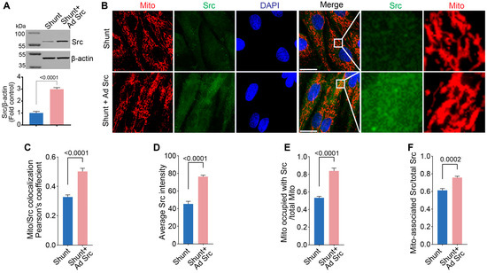 To determine if restoration of pp60Src in Shunt PAECs could positively impact mitochondrial function, we used an adenoviral expression construct to deliver a constitutively active pp60Src mutant (CA-Src) to Shunt PAECs. Using an adenoviral vector (Ad-CA-Src, MOI = 10), pp60Src protein levels were increased by ~3-fold in Shunt PAECs (Figure 7A). Using fluorescent microscopy, we evaluated how this impacted the intensity and mitochondrial localization of pp60Src protein (Figure 7B). Pearson’s coefficient analysis in the fluorescence colocalization study revealed increased mitochondrial pp60Src accumulation in CA-Src-expressing Shunt PAECs (Figure 7C). The colocalization of pp60Src (green) with mitochondrial TOMM20 (red) was then quantified using Manders’ correlation coefficient. The Manders’ overlap coefficient calculation showed increased pp60Src intensity in the cytoplasm of CA-Src-expressing Shunt PAECs (Figure 7D). We also observed an increased number of mitochondria with pp60Src accumulation (Figure 7E) as well as increased pp60Src mitochondrial accumulation (Figure 7F).