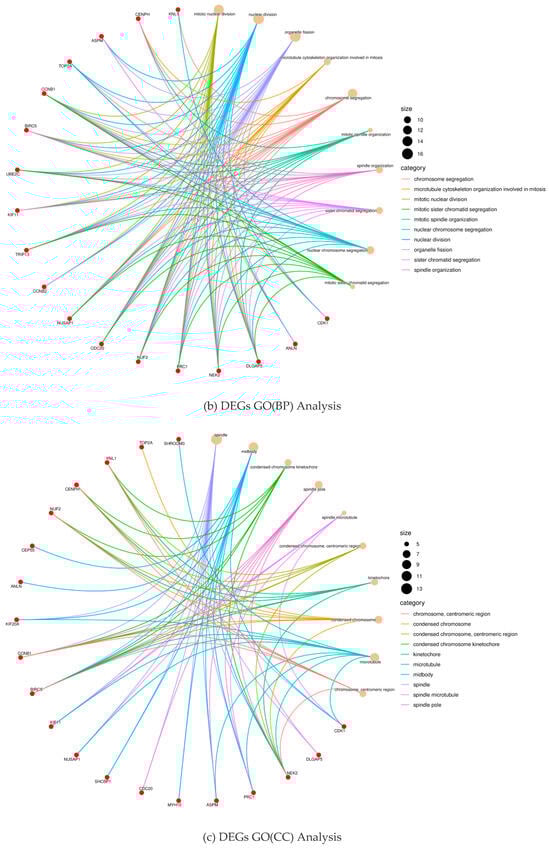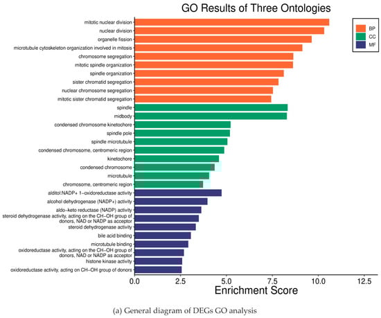 The obtained DEGs were imported into the DAVID (https://davidbioinformatics.nih.gov/, accessed on 12 August 2024) database to obtain relevant biological information. The gene ontology (GO) enrichment analysis and the Kyoto Gene-Genome Encyclopedia (KEGG) enrichment analysis were performed after the screening of the obtained biological information. Through bioinformatics analysis, we obtained information about the biological process of DEGs (biological process, BP), the cellular location of DEGs products (cellular component, CC), the activity of DEGs products at the molecular level (molecular function, MF) and the action pathway of DEGs, and visualized the analysis results.