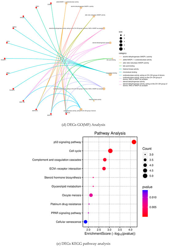 To further analyze how DGEs function on liver fibrosis in humans, we performed GO and KEGG enrichment analysis on the total 100 DEGs obtained from the DAVID database. Through GO enrichment analysis (Figure 2a), we found that DGEs were significantly enriched in biological processes, such as mitosis, nuclear division, organelle division, and mitosis, involved in microtubule cytoskeleton organization (Figure 2b). In addition, we found that DEGs were mainly involved in the spindle and the midbody (Figure 2c). In addition, these genes were mainly related to the aldehyde alcohol NADP + 1-oxidoreductase activity and alcohol dehydrogenase (NADP +) activity (Figure 2d). In KEGG enrichment analysis, DEGs mainly acted on the four pathways of p53 signaling (hsa04115), cell cycle (hsa04110), complement and coagulation cascade (hsa04610), and the interaction between ECM and receptor (hsa04512) (Figure 2e). All of the analysis results are presented in Figure 2.