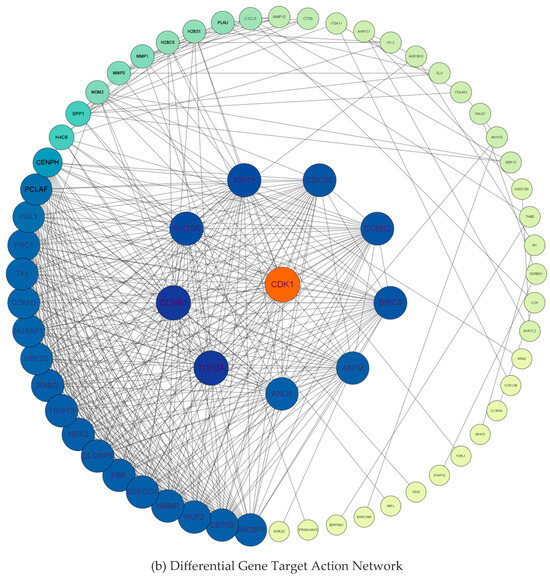 The DEGs were analyzed using the STRING database to construct a protein interaction network. Table 2 shows that the PPI network maps 85 nodes and 447 edges with reciprocal relationships, with a local clustering coefficient of 0.609 and a PPI enrichment p-value < 1.0 × 1016. Meanwhile, the hub differential genes were screened from the PPI network using the MCC algorithm and cytoNCA plugin with “Degree value” and “Betweenness value” as ranking conditions. As shown in Figure 3a,b, the first ranked DEG in two categories of different screening value conditions was CDK1. Therefore, based on the logical reliability analysis, we identified CDK1 as a new key target for the treatment of liver fibrosis.