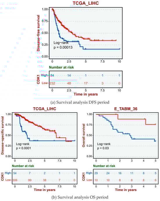In order to study the prognostic relationship between the CDK1 gene and liver fibrosis, we used the TCGA database (https://portal.gdc.cancer.gov, accessed on 13 August 2024) and GEO database (https://www.ncbi.nlm.nih.gov/geo/, accessed on 13 August 2024), combined with Kaplan–Meier plotter (http://kmplot.com/analysis/, accessed on 14 August 2024), to analyze the key DEG data and draw the survival curve.