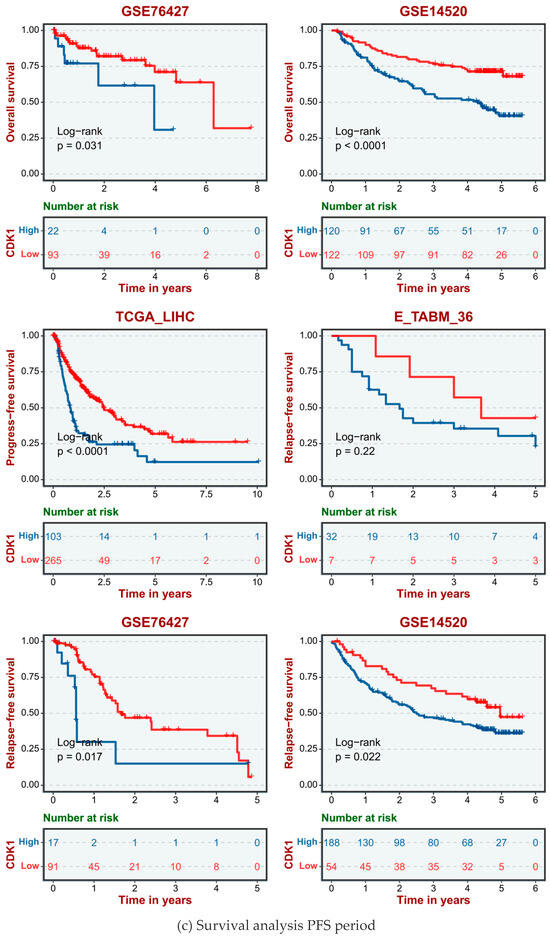 The human data sets and GSE database from TCGA data included TCGA_LIHC, E-TAMB_36, GSE14520, and GSE76427. According to the different expression levels of the CDK1 gene in human HCC cells, hepatocellular carcinoma cases were divided into a high CDK1 expression group and a low CDK1 expression group. The disease-free survival (DFS, Figure 4a), overall survival (OS, Figure 4b), and progression-free survival (PFS, Figure 4c) showed that the survival cycle of normal hepatocytes with high CDK1 gene expression was lower than that of normal hepatocytes with low CDK1 expression for a long time.