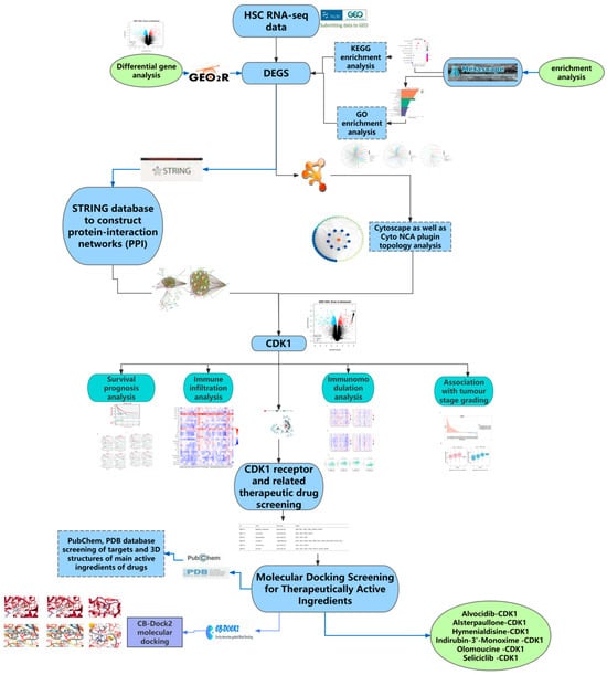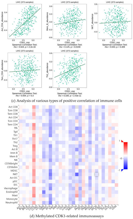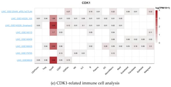 The relationship between CDK1 gene expression in Homa cells and each immune cell was determined by the Web server from the TIMER database (https://cistrome.shinyapps.io/timer/, accessed on 16 August 2024). A variety of cells associated with tumor immunity were evaluated for immune infiltration, were analyzed for their immunomodulatory effects, and results were visualized. The GEO database was used to obtain various data sets on hepatocellular carcinoma and make a visual heat map to analyze the expression levels of target genes in different cell types in different data sets in hepatocellular carcinoma.