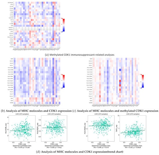Immunosuppressants have an inhibitory effect on the immune response of the body, which reduces the autoimmune response by inhibiting the proliferation and function of cells associated with the immune response. MHC (major histocompatibility complex) plays a crucial role in the immune system, not only determining the host tissue compatibility, but also is closely related to the host immune response and immune regulation. Through bioinformatics and related statistical methods, we visually demonstrate the different effects of immunosuppressants and immunostimulants on CDK1 and its methylated forms in hepatocellular carcinoma (HCC). By comparing the data on hepatocellular carcinoma obtained from public databases, we found that the expression of CDK1 contributed to the effect of multiple immunosuppressants, while methylated CDK1 showed the opposite trend, namely, the effect of immunosuppressants. This difference is clearly reflected in the cohesion heatmap (Figure 6a). In addition, we also observed that the expression changes in the MHC molecules TAP 1, HLA-DOB, HLA-DQA 1, and HLA-DQA 2 showed some positive correlation with CDK1 expression (Figure 6b,d) and negatively correlated with methylated CDK1 expression (Figure 6c). This further suggests a synergistic role of these molecules in immune regulation and tumorigenesis and development.