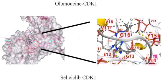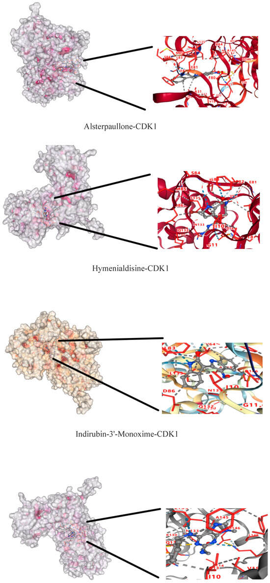 In the PubChem database (pubchem.ncbi.nlm.nih.gov, accessed on 22 September 2024) and the PDB database (www.rcsb.org, accessed on 22 September 2024), the 3D structure of all the active components and the protein crystal structure of CDK1 were obtained, and the above components and targets were matched one-to-one by molecular docking analysis on the CB-Dock 2 platform (http://cadd.labshare.cn, accessed on 22 September 2024).