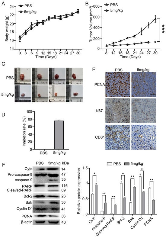 Antitumor effect of myristoyl-CM4 in PLC/PRF-5 xenograft mouse model. A PLC/PRF-5 xenograft model was established by subcutaneously injecting PLC/PRF-5 cells into BALB/c nude mice aged 4–6 weeks. Mice were divided into two groups; one was injected with PBS and the other injected with 5 mg/kg myristoyl-CM4. (A) Body weight and (B,C) tumor volume were determined every three days. Tumor growth curves over time were generated until mice were sacrificed on day 30. (D) Tumor inhibition rate was calculated according to tumor weight. (E) PCNA, CD31 and Ki67 expression levels were determined by immunohistochemistry. Scale bar represents 100 μm. (F) Lysates from tumor tissue were harvested and the levels of cytochrome c, Bak, caspase-9, caspase-3, PARP, cyclin D1, and PCNA levels were determined using western blotting. ns, no significance * p < 0.05, ** p < 0.01, *** p < 0.001.