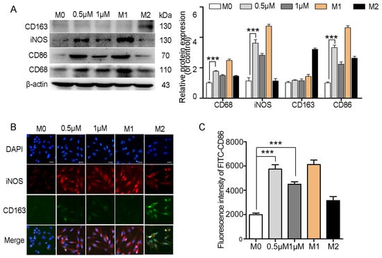 THP-1 cells were plated on 24-well glass slides and polarized to M0/M1/M2 macrophages. After treatment, cells were fixed with 4% paraformaldehyde and permeabilized with 1% Triton X-100. Cells were incubated with primary antibodies against Arg-1, CD163, or iNOS at 4 °C overnight. After washing, cells were incubated with secondary antibodies conjugated with fluorescent dyes for 1 h in the dark. DAPI was used for nuclear counterstaining. Fluorescence imaging was performed using a fluorescence microscope (Nikon, Tokyo, Japan).