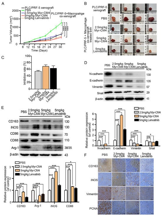 Antitumor effect of myristoyl-CM4 in PLC/PRF-5/macrophage co-xenograft model. PLC/PRF-5 cells and M0 macrophages were injected subcutaneously into nude mice aged 4–6 weeks to generate a co-xenograft mouse models, which were divided into PBS, 2.5 mg/kg myristoyl-CM4, 5 mg/kg myristoyl-CM4, and 5 mg/kg lenvatinib groups. (A) Tumor volumes were determined every three days and tumor growth curves over time were graphed. (B) Mice were sacrificed on day 30 and the tumors were dissected. (C) Comparison of tumor growth inhibition rate among different treatment groups. (D) Macrophage, and (E) EMT marker levels in tumor tissues were determined using western blotting. (F) Paraffin sections were prepared for immunohistochemical staining using anti-iNOS and anti-CD163 to analyze M1 and M2 macrophages. Representative images from each group are shown. “—” represented the scale bar of 100 μm. ns, no significance. * p < 0.05, ** p < 0.01, *** p < 0.001.