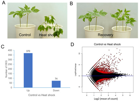 A transcriptome analysis of P. ginseng leaves after heat-shock treatment. (A) P. ginseng plants immediately after heat-shock treatment at 40 °C for 1 h. (B) P. ginseng plants 24 h after recovery at 25 °C. (C) The number of up/downregulated DEGs. (D) MA plot showing differential expression analysis of RNA-seq samples. The y-axis represents the log2-fold change, and the x-axis represents the normalized mean expression. Red points indicate the most significantly differentially expressed genes (DEGs).