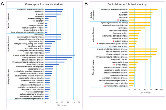 GO classification of the assembled unigenes in the ginseng transcriptome. Three main GO categories were shown in BP, CC, MF. (A) GO classification of control up vs. 1 h heat-shock down. (B) GO classification of control down vs. 1 h heat-shock up. The GO terms were shown at the vertical axis, the gene number were given at the horizontal axis. Asterisks in red indicate the new representation of subcategories in the heat-shock-treated group.