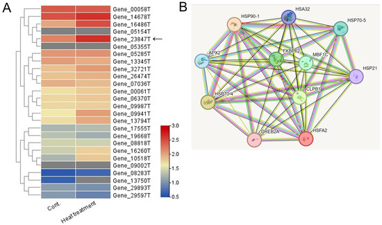Heatmap and predicted protein–protein interaction network of 26 annotated HSF unigenes in ginseng leaves. (A) A heatmap analysis illustrating the expression levels of (DEGs among 26 annotated HSF unigenes under control and heat-shock treatment conditions. Expression levels are represented with a color gradient, where red denotes high expression and blue denotes low expression. An arrow indicates a unigene showing the greatest increase in expression following heat-shock treatment. (B) Predicted protein–protein interaction network involving the predicted ORF of a TF unigene (Gene_23847T) and associated HSPs. Homologous proteins from Arabidopsis thaliana were used as references. Edges represent predicted protein–protein associations, with the analysis conducted using STRING v11.0 and a minimum interaction score set to “medium confidence” (0.3).
