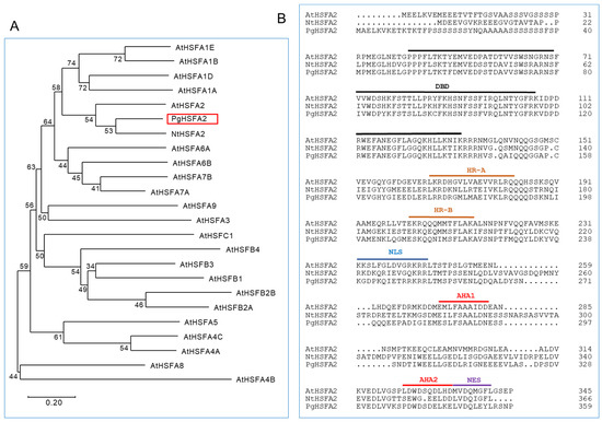 A phylogenetic and ClustalW analysis of P. ginseng PgHSFA2 and other plant HSFA proteins. (A) A phylogenetic tree of PgHSFA2 and other plant HSFA proteins. PgHSFA2 is highlighted with a red box. (B) ClustalW alignment of the amino-acid sequence of PgHSFA2 with AtHSFA2 (from A. thaliana) and NtHSFA2 (from N. tabacum). The conserved domains are labeled DBD (DNA-binding domain), HR-A and HR-B (hydrophobic heptad repeats), NLS (nuclear localization signal), AHA (aromatic, large hydrophobic, and acidic amino-acid residues), and NES (nuclear export signal). NCBI protein accession numbers: P. ginseng PgHSFA2, OQ134777; A. thaliana AtHSFA2, AEC07800; N. tabacum NtHSFA2, XP_004985605.1.