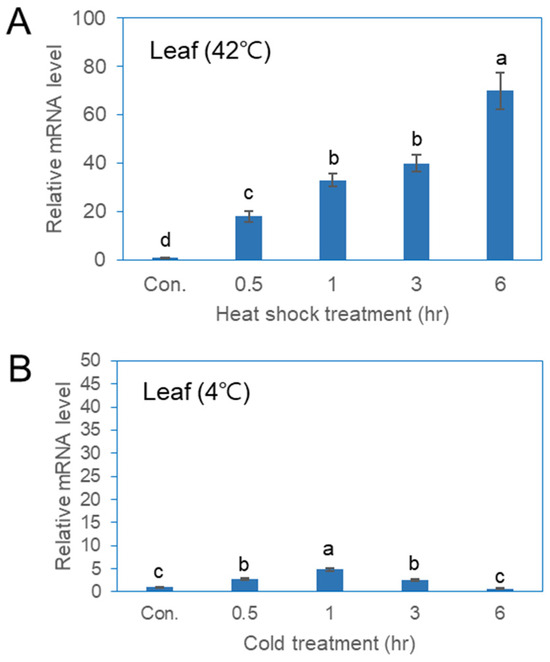 qRT-PCR analysis of PgHSFA2 expression in P. ginseng under various environmental stresses. (A) PgHSFA2 expression in leaves after treatment at 42 °C for 0.5, 1, 3, and 6 h. (B) PgHSFA2 expression in leaves after treatment at 4 °C for 0.5, 1, 3, and 6 h. The ginseng β-actin gene was used for normalization. The data presented are the mean ± SE of the transcripts obtained from at least three independent experiments. Bars marked with different letters denote statistically significant differences (p < 0.05, one-way ANOVA).