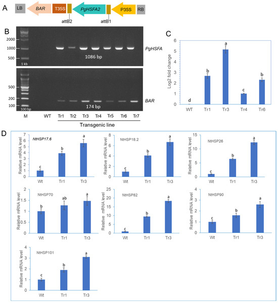 Transgenic tobacco plants were generated by infecting leaf segments with Agrobacterium tumefaciens carrying the PgHSFA2 and BAR (BASTA resistance) genes (Figure 6A). To identify putative transgenic plants overexpressing PgHSFA2, genomic PCR was performed (Figure 6B). Among the seven tested lines, transgenic lines Tr1, Tr3, Tr4, and Tr6 were selected for further analysis. The qRT-PCR analysis revealed that PgHSFA2 expression was highest in Tr3 among the four transgenic lines (Figure 6C).