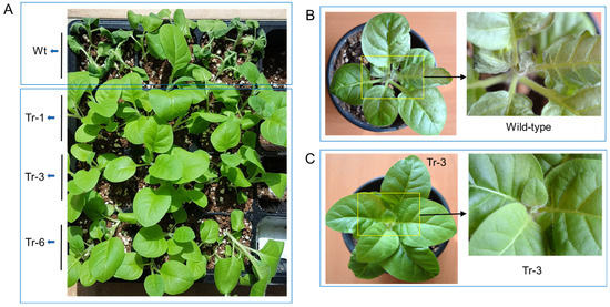 One-month-old transgenic tobacco plants (Tr-1, Tr-3, and Tr-6) and wild-type plants were subjected to high-temperature stress (45 °C for 3 h). After a 3-day recovery period, wild-type plants exhibited severe leaf wilting. In contrast, the leaves of transgenic tobacco plants had recovered to a healthy state (Figure 7A). Similarly, when two-month-old wild-type and transgenic (Tr-3) tobacco plants were treated at 50 °C for 1 h, wild-type plants showed significant leaf damage, particularly at the shoot tips, after 3 days of recovery (Figure 7B). In contrast, Tr-3 plants maintained a healthy appearance in both leaves and shoot tips (Figure 7C).