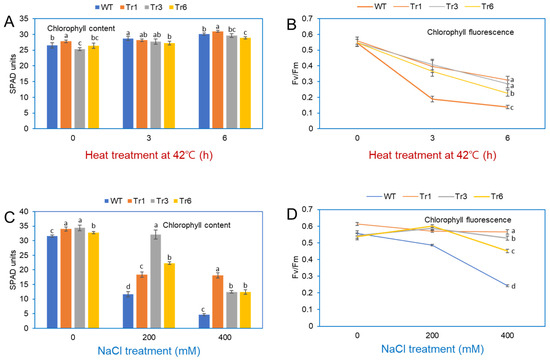 Chlorophyll content and fluorescence in leaves of wild-type and transgenic tobacco overexpressing PgHSFA2 after heat and salt treatment. (A) Chlorophyll content in leaves after heat treatment at 42 °C for 0, 3, and 6 h. (B) Fv/Fm measurements (maximum quantum efficiency of Photosystem II) after heat treatment at 42 °C for 0, 3, and 6 h. Data are presented as average relative quantities ± standard errors (SEs). (C) Chlorophyll content in leaves after salt treatment with 0, 200, and 400 mM NaCl. (D) Fv/Fm measurements after salt treatment with 0, 200, and 400 mM NaCl. Data are presented as average relative quantities ± standard errors (SEs). Bars marked with different letters denote statistically significant differences (p < 0.05, one-way ANOVA).