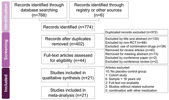 The search and selection process for trials yielded a comprehensive set of studies for inclusion in this meta-analysis (Figure 1). Our initial search across four databases (PubMed, Embase, Cochrane Library, and Web of Science) along with an additional search using PubMed’s ‘related articles’ feature, yielded a total of 774 trials. After removing duplicates, 402 unique trials remained and were subjected to title and abstract screening, resulting in the exclusion of 358 trials. A detailed full-text review of the 44 remaining trials led to the exclusion of 23 trials for reasons including the absence of a placebo control group (10 trials [18,19,20,21,22,23,24,25,26,27]), being a cohort study (1 trial [28]), involving participants under 18 years old (6 trials [29,30,31,32,33,34]), lack of full-text availability (2 trials [35,36]), combination with other medication (2 trial [37,38]) and outcomes unrelated to the study’s focus (2 trials [39,40]). Ultimately, 21 trials met the inclusion criteria and were included in this meta-analysis [7,8,9,10,11,12,41,42,43,44,45,46,47,48,49,50,51,52,53,54,55]. Table 1 summarizes the key characteristics of the included trials, which were published between 2004 and 2023. These 21 trials involved a total of 1723 participants, with the number of participants per trial ranging from 11 to 273. The primary objective of all included trials was to assess the potential effects of vitamin D on chronic pruritus.