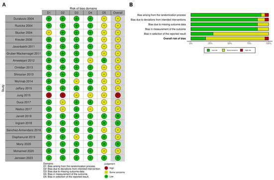 Most of the included trials (Figure 2) were identified as having some concerns of bias, particularly in the selection of reported outcomes. Most studies exhibited a low risk of bias in the randomization process, suggesting that randomization was generally well-executed. However, certain studies, such as Stücker (2004; [7]) and Jung (2015; [9]), lacked sufficient details, resulting in uncertainty in this domain. In terms of deviations from intended interventions, most trials maintained a low risk of bias, indicating that the interventions were administered as planned without substantial deviations that could influence the results. Nevertheless, Jung (2015; [9]) demonstrated a higher risk of bias in this area, which may have impacted its findings. Regarding missing outcome data, the risk of bias varied across studies, with Wohlrab (2014; [12]), Jung (2015; [9]), and Disphanurat (2019; [53]) exhibiting some concerns due to incomplete data reporting. In the assessment of outcome measurement, most trials were considered to have a low risk of bias, but Amestejani (2012; [46]), Jung (2015; [9]), and Nistico (2017; [52]) were flagged as having some concerns, likely due to their open-label study designs. Overall, studies such as Jung (2015; [9]) demonstrated a high risk of bias across multiple domains, which may affect the reliability of their findings. Conversely, other studies, including [49,51,54,55], were categorized as having a low overall risk of bias, suggesting that their results are more reliable and robust. While most studies exhibited a low risk of bias in key areas, some showed high or unclear risks across multiple domains, necessitating careful interpretation of their findings in the broader context of this meta-analysis.