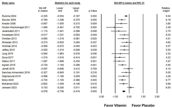 For each included study, the SMD and 95% confidence intervals (CIs) were calculated to compare outcomes between the vitamin supplementation and placebo groups. A random-effects model was applied to account for variability among studies. All statistical analyses were conducted using Comprehensive Meta-Analysis software (version 3.0 Biostat, Englewood, NJ, USA). To assess heterogeneity, the I2 statistic was used, with values exceeding 50% indicating substantial heterogeneity. Publication bias was evaluated using funnel plots and Egger’s regression test, with statistical significance set at p < 0.05 for most analyses, except for publication bias, where a threshold of p < 0.10 was applied. Additionally, subgroup analyses were conducted to explore potential sources of heterogeneity, while sensitivity analyses systematically excluded individual studies to assess the robustness of the overall findings.
